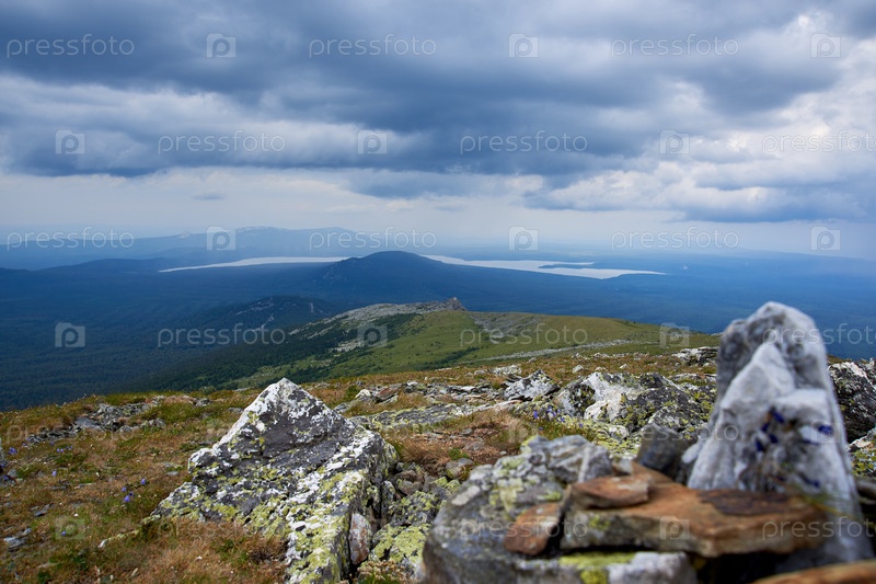 Зеленые горы, покрытые лесом, грозовые тучи, вид сверху с камнем