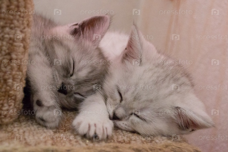 Два милых британских бело-серых котенка спят вместе в кошачьем домике