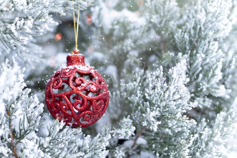 Один красный шар висит на туе, хвойном дереве
