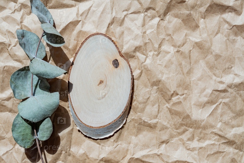 Пустой круглый деревянный подиум для презентации продукта, ветка эвкалипта на бумажном фоне. Фон из натуральных материалов для косметической рекламы крупным планом, вид сверху