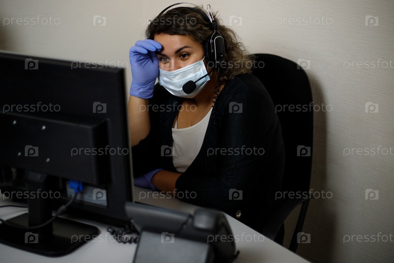 Агент колл-центра, работающий на горячей линии поддержки в офисе, в маске и перчатках. Оператор колл-центра разговаривает с клиентом. Крупный план. Телемаркетолог, агент телемаркетинга, делает видеозвонок конференции, разговаривает с онлайн-клиентом на ко