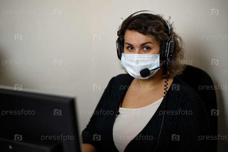 Агент колл-центра, работающий на горячей линии поддержки в офисе, в маске и перчатках. Оператор колл-центра разговаривает с клиентом. Крупный план. Телемаркетолог, агент телемаркетинга, делает видеозвонок конференции, разговаривает с онлайн-клиентом на ко
