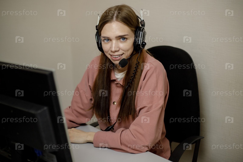 Счастливый агент колл-центра, работающий на горячей линии поддержки в офисе. Оператор колл-центра разговаривает с клиентом. Крупный план. Телемаркетолог, агент телемаркетинга, делает видеозвонок конференции, разговаривает с онлайн-клиентом на компьютере