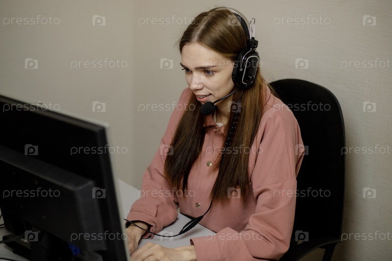 Счастливый агент колл-центра, работающий на горячей линии поддержки в офисе. Оператор колл-центра разговаривает с клиентом, глядя на экран компьютера крупным планом. Телемаркетолог, агент телемаркетинга, делает видеозвонок конференции, разговаривает с онл