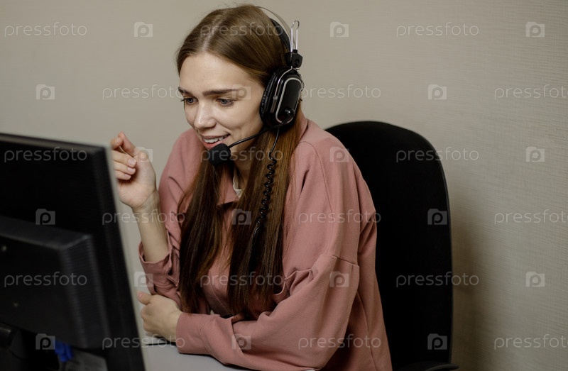 Счастливый агент колл-центра, работающий на горячей линии поддержки в офисе. Оператор колл-центра разговаривает с клиентом, глядя на экран компьютера крупным планом. Телемаркетолог, агент телемаркетинга, делает видеозвонок конференции, разговаривает с онл