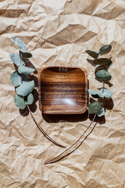 Квадратный деревянный подиум и ветка эвкалипта на бумажном фоне. Макет натурального продукта с миской и зелеными листьями. Современная эко косметическая реклама. Презентация красоты. Вид сверху