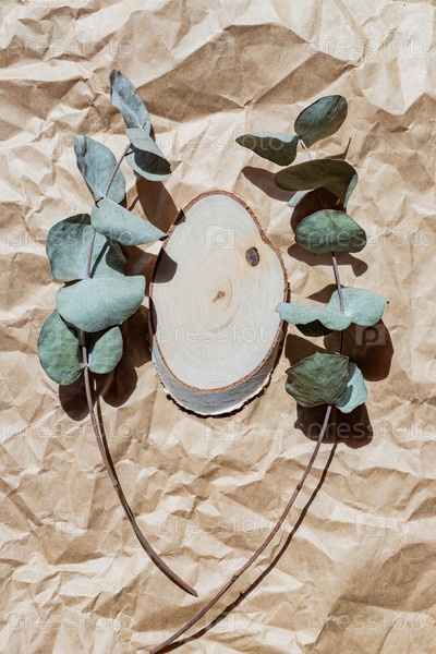 Вид сверху на пустой деревянный срез с листьями эвкалипта на бумажном фоне. Макет презентации товаров или косметики