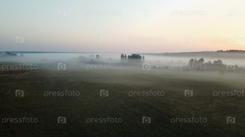 Сельский пейзаж на рассвете. Зеленый пейзаж в тумане. Аэрофотосъемка