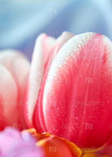 Много тюльпанов с каплями воды - близкий букет к празднику 8 марта