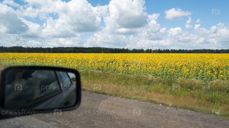 Вид на поле подсолнухов в солнечный день внутри машины