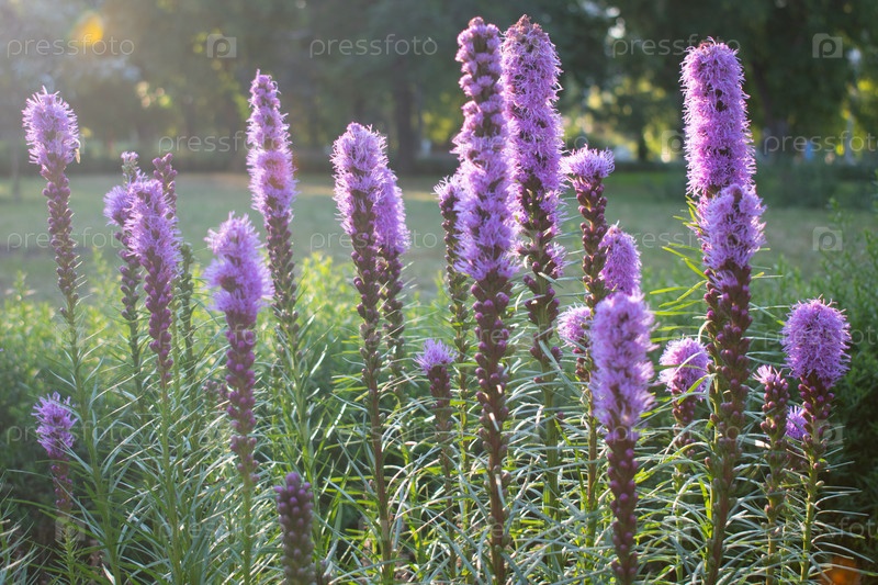 Розовые и фиолетовые цветы Лиатриса в саду или парке на фоне яркого солнечного света и зеленой травы. Крупный план цветов при солнечном свете, на рассвете или закате
