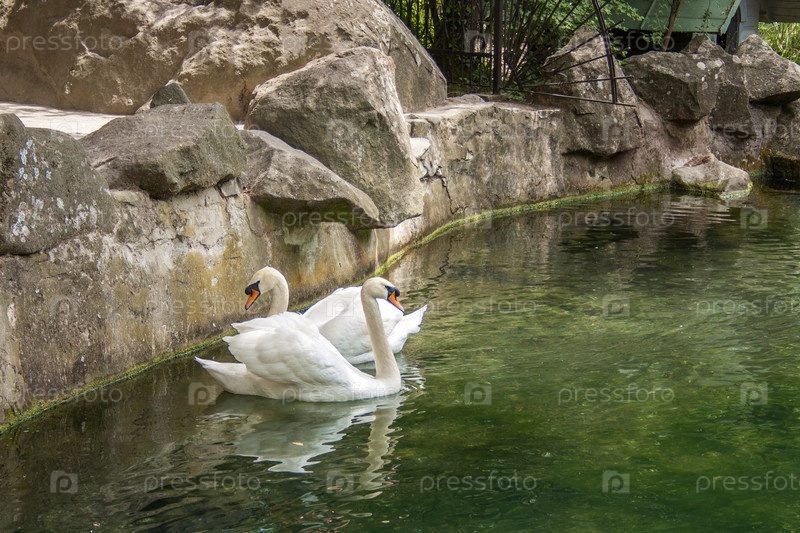 Взрослые белые птицы лебеди плавают в воде