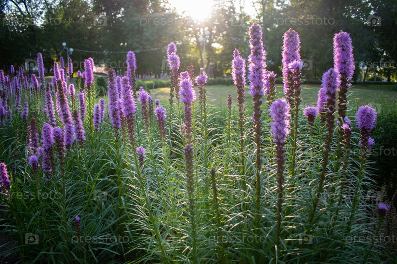 Liatris pycnostachya розово-фиолетовый цветок в саду или парке на фоне яркого солнечного света и зеленой травы