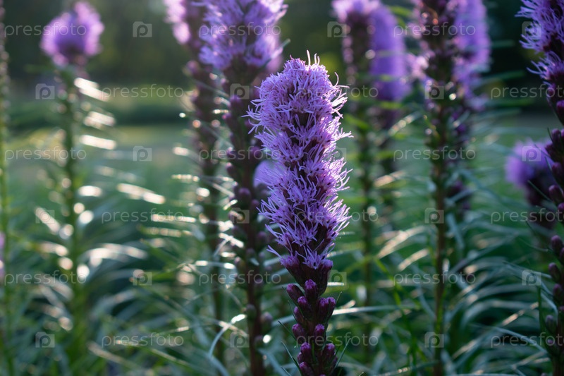 Liatris pycnostachya розово-фиолетовый цветок в саду или парке на фоне яркого солнечного света и зеленой травы