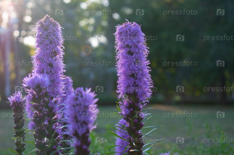 Liatris pycnostachya розово-фиолетовый цветок в саду или парке на фоне яркого солнечного света и зеленой травы