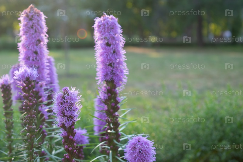 Liatris pycnostachya розово-фиолетовый цветок в саду или парке на фоне яркого солнечного света и зеленой травы