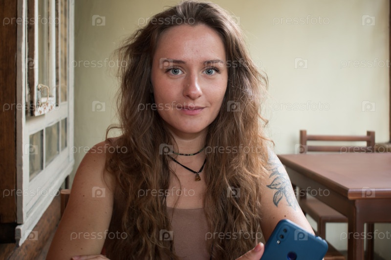 Симпатичная девушка с распущенными волосами и голубо-зелеными глазами улыбается на фоне старой славянской хижины, сидя на веранде своего дома и держа смартфон