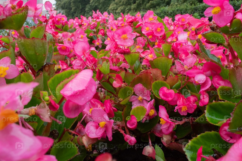 Поляна мелких розовых и красных цветов крупным планом в дождливую погоду. Цветы с каплями воды