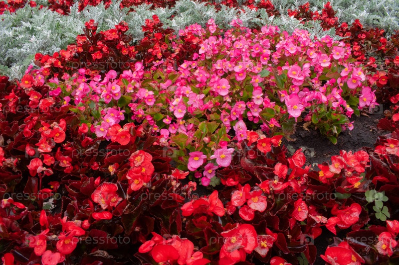 Поляна мелких розовых и красных цветов крупным планом в дождливую погоду. Цветы с каплями воды