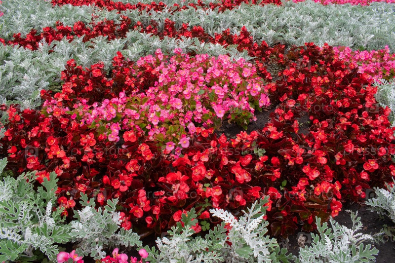 Поляна мелких розовых и красных цветов крупным планом в дождливую погоду. Цветы с каплями воды
