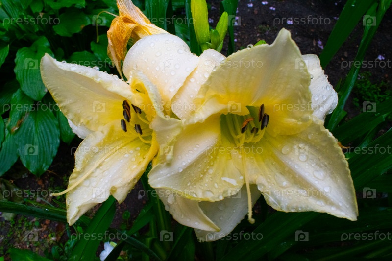 Яркие белые и желтые цветы в пасмурную и дождливую погоду с каплями воды