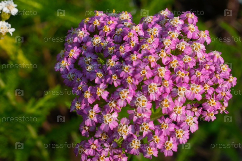 Маленькие розовые и белые цветы крупным планом, снятые на фоне травы при ярком солнечном свете в течение дня. Лучи утреннего солнца. Цветы в диком заросшем парке