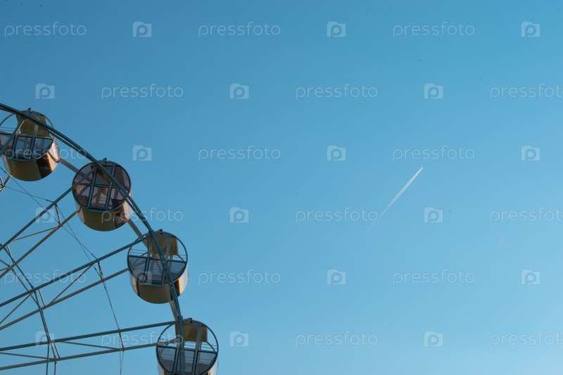 Колесо обозрения без людей в ясном голубом небе. Колесо обозрения в парке при ярком солнечном свете днем. Большая белая круглая конструкция. Аттракционы и аттракционы для детей