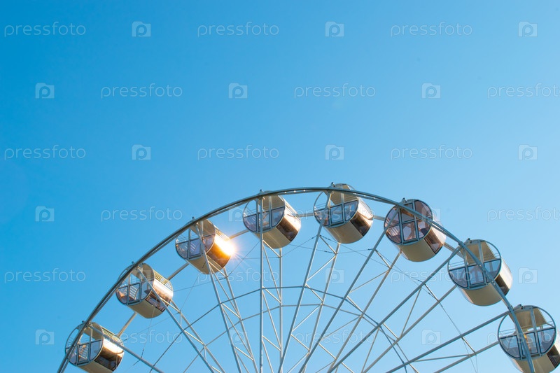 Колесо обозрения без людей в ясном голубом небе. Колесо обозрения в парке при ярком солнечном свете днем. Большая белая круглая конструкция. Аттракционы и аттракционы для детей