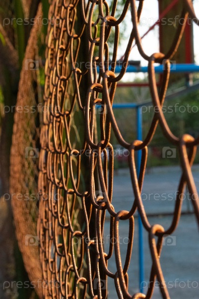 Старая сетчатая сеть из коричневой ржавой проволоки. Старая ржавая металлическая проволочная сетка на открытом воздухе расфокусирует фон, размытая текстура, винтажный объектив с мягким фокусом. Яркий солнечный день, восход солнца