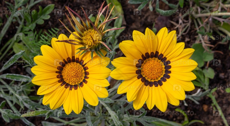 Большой план двух красивых желтых садовых цветов Газания Gazania linearis на клумбе в парке