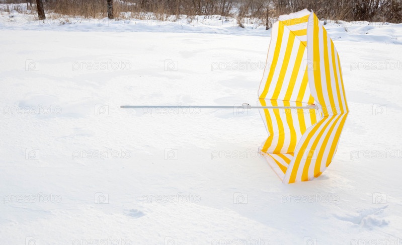 Упавший ярко-желтый полосатый пляжный зонтик на белом снегу в парке на заснеженной поляне