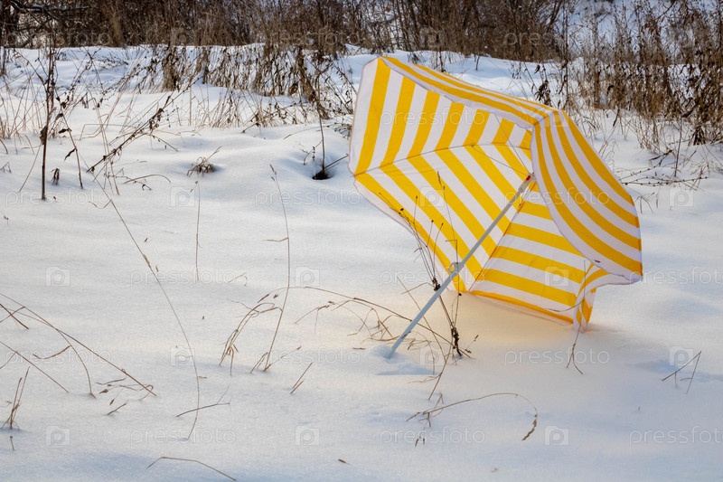 Упавший ярко-желтый полосатый пляжный зонтик на белом снегу в парке на заснеженной поляне