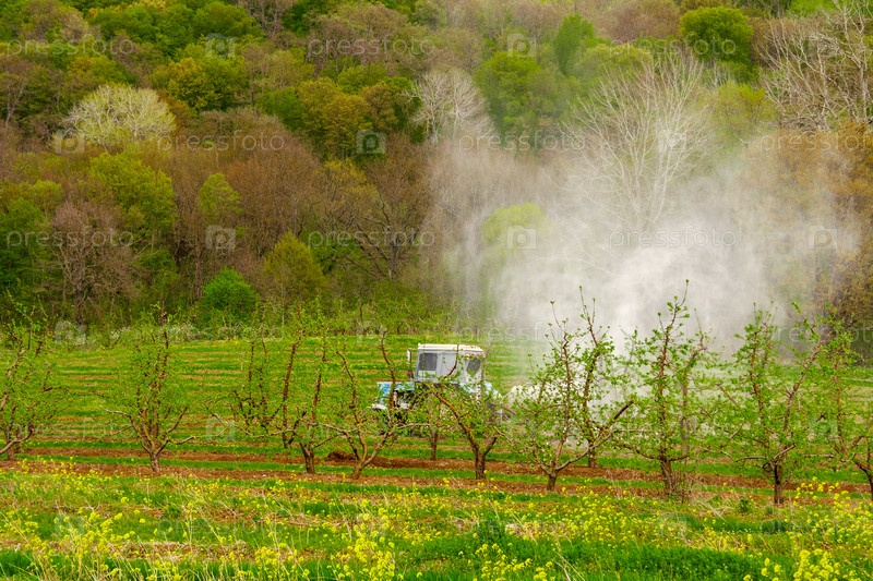 Опрыскивание плодовых деревьев пестицидами для защиты от вредителей