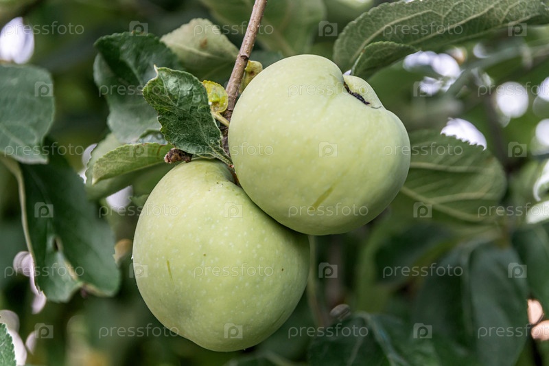 Зеленые яблоки на ветке в саду