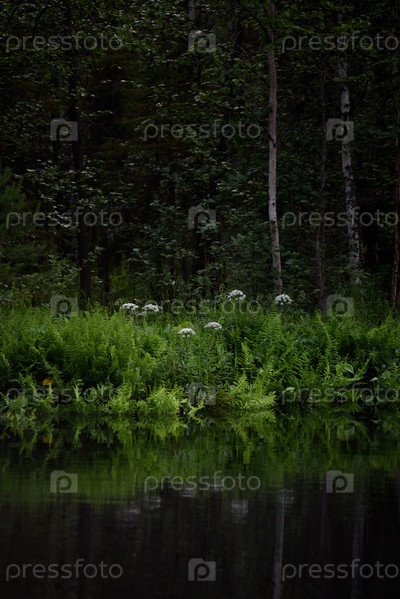 Вид на лесное озеро летом после захода солнца