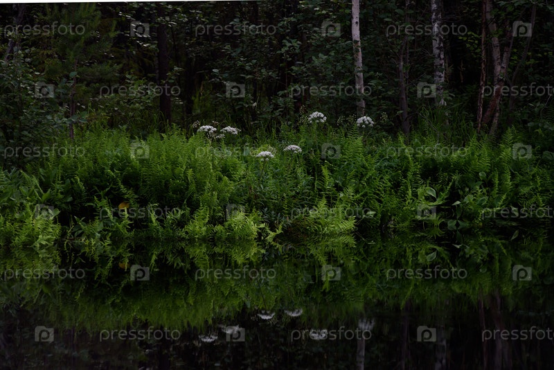 Вид на лесное озеро летом после захода солнца