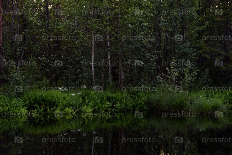 Вид на лесное озеро летом после захода солнца