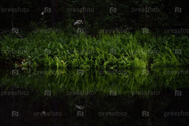 Вид на лесное озеро летом после захода солнца