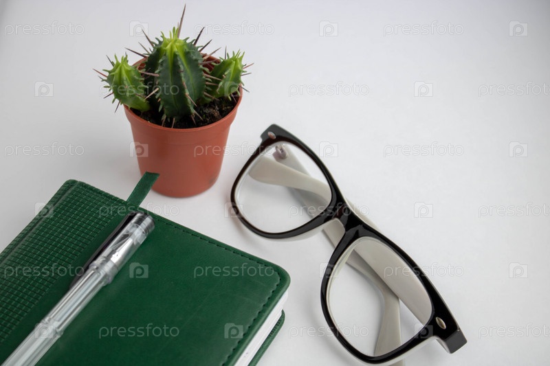 Офисный стол с очками, горшком с кактусом и блокнотом с ручкой. Вид сверху с копией пространства