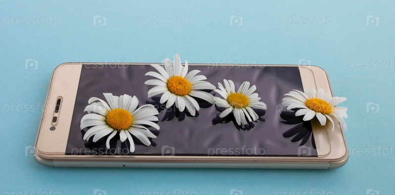Золотой смартфон с цветами ромашки лежит на синем фоне. Летняя концепция. Природа и новые технологии