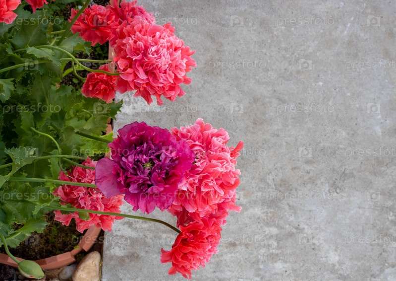 Розовый мак в форме пиона на фоне серого бетона