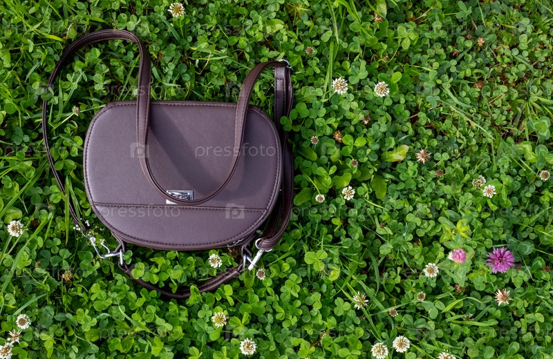 Коричневая женская сумочка лежит на цветных камнях. Место для вашего текста