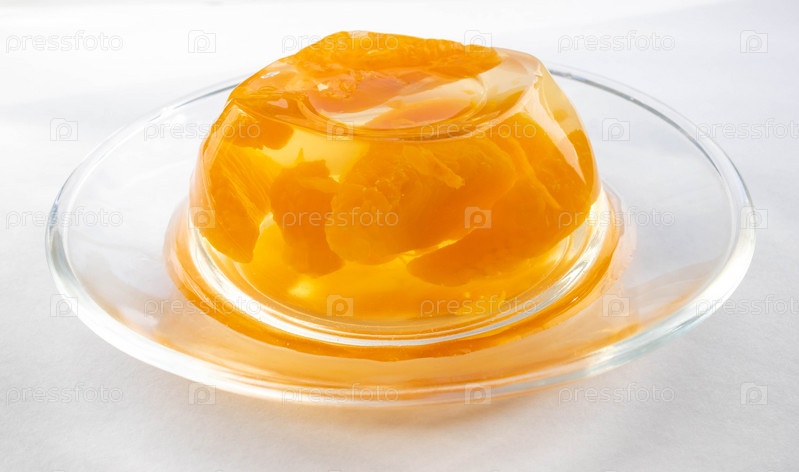 Стеклянная тарелка мандаринового желе со свежими ломтиками на белом фоне
