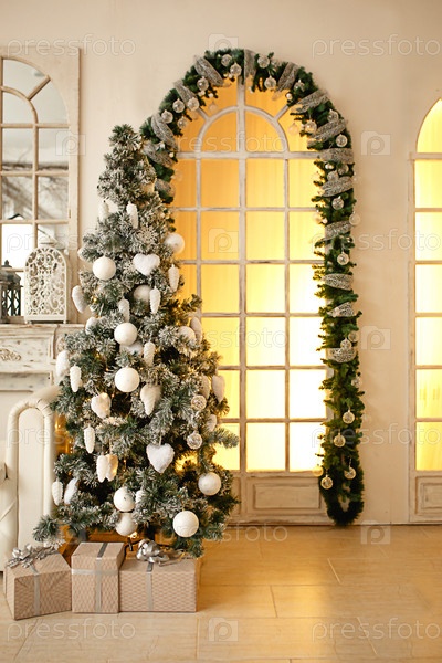 Рождественская зеленая искусственная елка в светлой комнате дома возле большого окна от пола до потолка с желтым светом. Украшен белыми шариками, шишками. Подарочные коробки из крафт-бумаги. Новый год