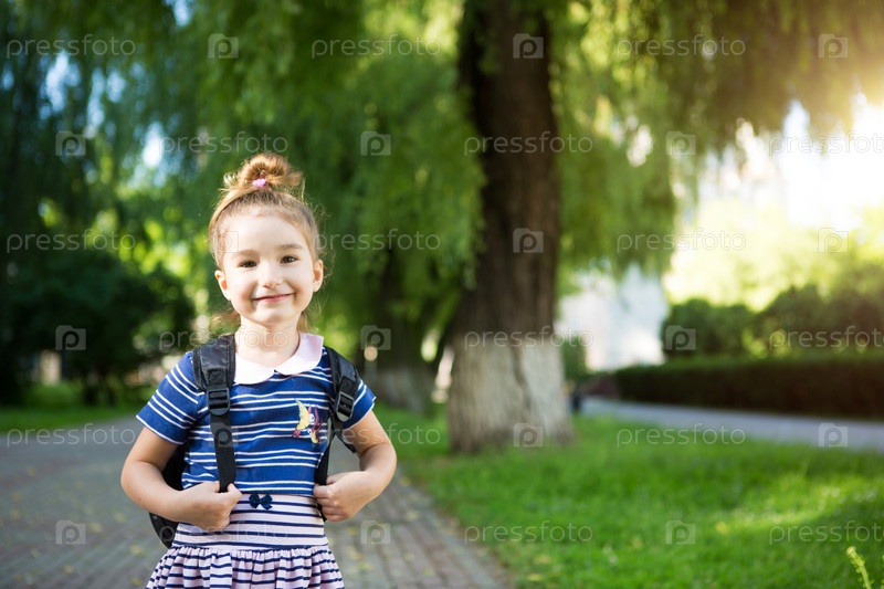 В кадр смотрит маленькая девочка внешности в школьной форме с рюкзаком. Концепция обратно в школу. Начальная школа, развивающие занятия для дошкольников. Место для текста