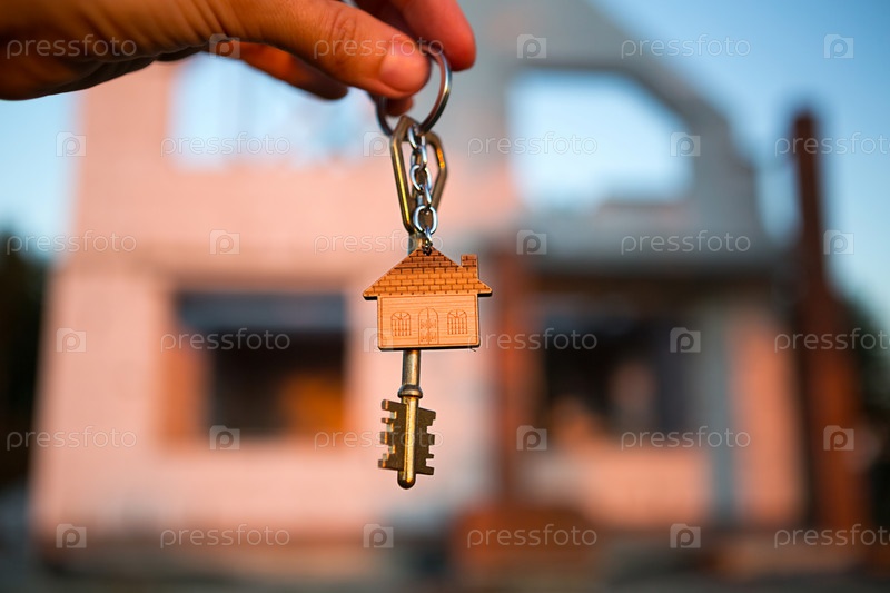 Рука с ключом от будущего дома на фоне строительной площадки и стен из пористого бетонного блока. Строительство дома, переезд в новый коттедж, ферма в деревне