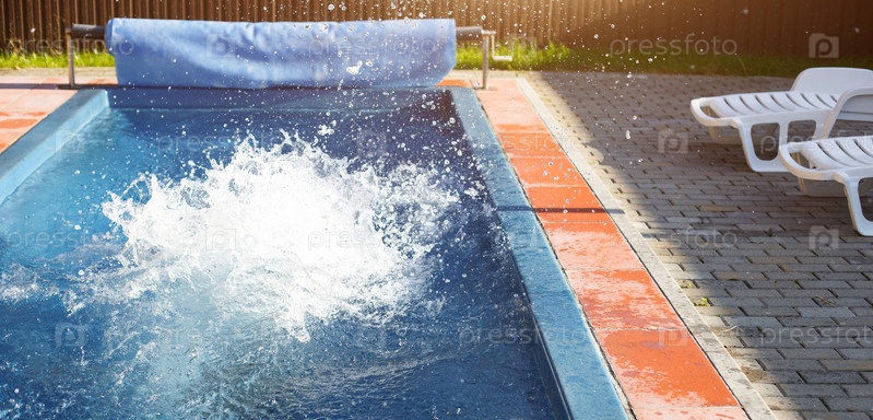 Брызги в открытом бассейне возле белых шезлонгов. Зона отдыха на курорте, абонемент в гостиницу, сауна и СПА, спорт и плавание. Копировать пространство