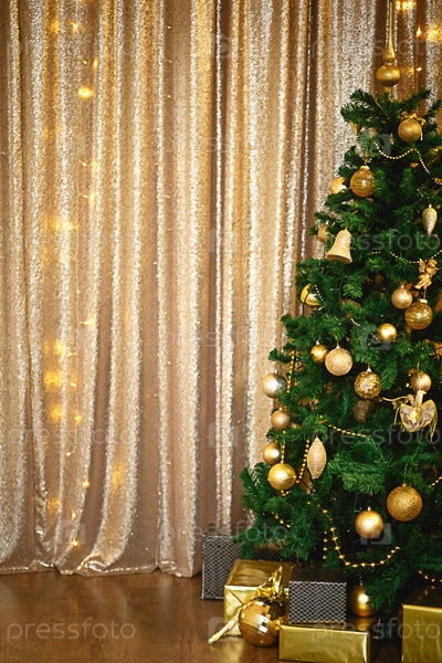 Рождественская зеленая искусственная елка в Золотой комнате с гирляндами, украшенными золотыми шарами, бисером и игрушками. Коробка с подарками в фольге и черной бумаге. Новый год. Место для текста