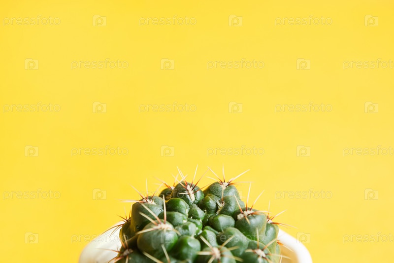 Кактус в горшке на желтом фоне. Комнатное растение, зеленый дом. Скопируйте пространство. Уход за комнатными растениями