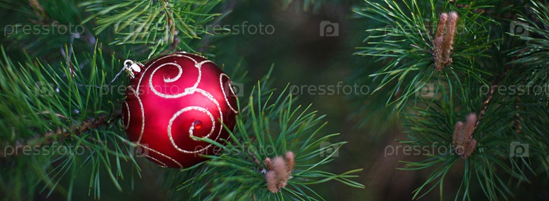 Красный елочный шар лежит на длинных зеленых иголках сосновых ветвей. Новогодняя концепция, зеленый природный фон-еловый патерн. Место для текста
